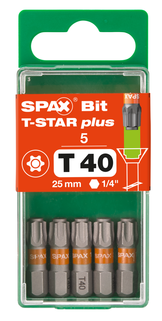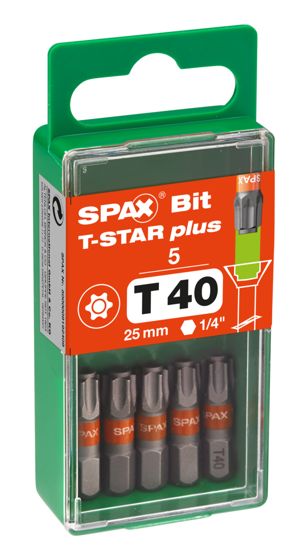 Passend zu unserem SPAX Sortiment mit T-STAR plus Kraftangriff bieten wir exakt auf unsere Schrauben abgestimmte SPAX Bits in T-STAR plus-Ausführung, gut erkennbar an der orangenen Farbcodierung. Die Bits gibt es in den Klingengro¨ßen T10 bis T50. Durch die SPAX Bits T-STAR plus erreichen Sie eine bessere Kraftu¨bertragung durch perfekten Passsitz, eine ho¨here Standzeit und ein schnelleres Einfa¨deln. Der saubere Sitz des Bits bedeutet zudem eine bessere Fu¨hrung, etwa bei Verschraubungen u¨ber Kopf. Die SPAX T-Star plus Bits erkennen Sie an der orangenen Farbmarkierung, die Klingengröße ist anhand der entsprechenden Aufdrucks sowie der Prägung ersichtlich. Die La¨nge unserer kurzen SPAX Bits T-STAR plus liegt bei 25 mm. Das perfekt aufeinander abgestimmte System T-Star plus, bestehend aus Schraube und Bit, bietet Ihnen immer das optimale Schrauberlebnis.