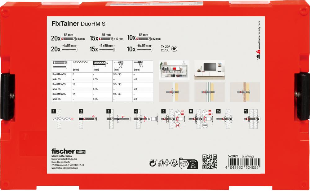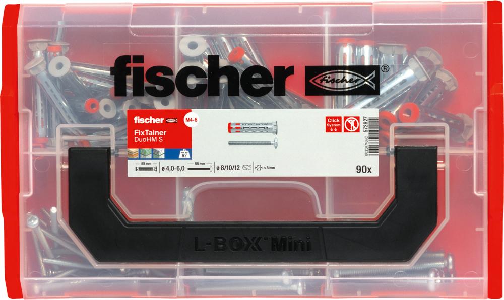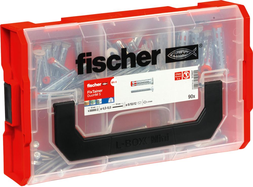 FIXtainer Hohlraumdübel DuoHM S, 90-teilig • Einfache Montage mit Akkuschrauber ohne Setzwerkzeug • Hohe Lasten durch Zweikomponenten-Technologie • Dübelrand aus Nylon verhindert Schäden an Baustoffoberfläche • Mitdrehsicherung aus Nylon schützt die Oberfläche des Baustoffs vor Beschädigungen • Flexibler Einsatz in zahlreichen Baustoffen wie Gipskarton - und Gipsfaserplatten, Hohldecken, Holzwolle-Leichtbauplatten, Spanplatten, Sperrholzplatten Lieferung: In L-BOXX mini. Inhalt: 20 x DuoHM 4 x 55 20 x Schraube M4 x 55 15 x DuoHM 5 x 55 15 x Schraube M5 x 55 10 x DuoHM 6 x 55 10 x Schraube M6 x 55 20 x DuoHM 4 x 55 20 x Schraube M4 x 55 15 x DuoHM 5 x 55 15 x Schraube M5 x 55 10 x DuoHM 6 x 55 10 x Schraube M6 x 55 Hersteller: fischer Deutschland Vertriebs GmbH, Klaus-Fischer-Str. 1, 72178 Waldachtal, DE, +497443124738, info@fischer.de