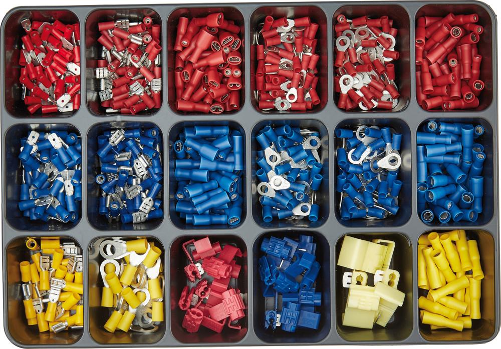 Sortiment Nr. 39 • 690-teiliges Sortiment mit isolierten Flach-/Fix- und Quetschverbindern Lieferung: Im stabilen Stahlblechkoffer. Flachsteckzunge mm: rot 6,3 0,25–1,0 blau 6,3 1,5–2,5 Flachsteckhülse mm: rot 6,3 0,25–1,0 blau 6,3 1,5–2,5 gelb 6,3 4–6 Flachsteckhülse mm (isoliert): rot 6,3 0,25–1,0 blau 6,3 1,5–2,5 Ringzunge mm: rot M4 0,25–1,0 rot M5 0,25–1,1 blau M5 1,5–2,5 blau M6 1,5–2,5 gelb M8 4–6 Stoßverbinder mm: rot 0,25–1,0 blau 1,5–2,5 gelb 4–6 Abzweig-/Fixverbinder mm: rot 0,25–1,0 blau 1,5–2,5 gelb 4–6