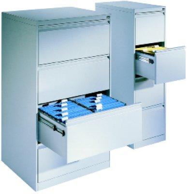 • Material: Stahlkonstruktion mit hochwertiger Einbrennbeschichtung RAL 7035 lichtgrau • Gehäuse 1-bahnig: körperschallgedämpft, mit doppelwandigen Schubladenblenden • Schubladen: frontbündig, mit integrierter, durchgehender Griffleiste, Vollauszug auf Kugelrollen-Teleskopschienen, mit Auszugsperre • Tragkraft pro Schub: ca. 50 kg • Zentralverschluss: mit Wechsel-Schlosszylinder, mit 2 Schlüsseln • Kunststoffgleiter: für den Bodenschutz Hinweis: Für Hängehefter DIN A4.