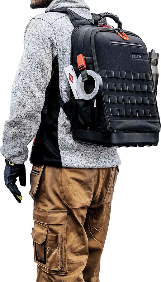 Werkzeugrucksack Nr. 00 21 50 E Modular X18 Elektro, 30-teilig • Aus Recycling-Kunstfasern • Aufklappbare Vorder- und Rückseite mit herausnehmbarer Werkzeugtafel • Ergonomische Rückenpolsterung • Optimale Flexibilität durch FIDLOCK-Adaptern und MOLLE-Bändern • 21 Haltelaschen und 37 Taschen, teilweise mit Reißverschlüssen • Bodenschale aus schlagfestem Kunststoff, 60 mm hoch • Kofferlasche zur Fixierung an Teleskopgriffen von Werkzeugkoffern • Abmessung (B x L x H): 340 x 210 x 530 mm Inhalt: 1 Automatische Abisolierzange PreciStrip16 190 mm 1 Abmantelungswerkzeug ErgoStrip 135 mm 1 Selbsteinstellende Crimpzange für Aderendhülsen 180 mm 2 VDE-Schraubendreher Slim für Schlitz-Schrauben 3,5; 5,5 mm 2 VDE-Schraubendreher Slim für Kreuzschlitz-Schrauben PZ 1; PZ 2 1 VDE-Schraubendreher Slim für Kreuzschlitz-Schrauben PZ/S 1 1 VDE-Spitz-Kombizange 185 mm 1 VDE-Flachrundzange mit Schneide (Storchschnabelzange) 200 mm 1 VDE-Elektronik-Seitenschneider Electronic Super Knips 1 VDE-Elektro-Installationszange 200 mm 1 VDE-Seitenschneider 160 mm 1 VDE-Kabelmesser 190 mm 1 Winkelschraubendreher-Satz, 10-teilig, 1,5–10 mm 1 Schlosserhammer 300 g 1 Mini-Wasserwaage 68 mm 1 Wasserwaage 30 cm 1 Kunststoffrohrschneider BiX 1 Schaltschrankschlüssel TwinKey 1 Tieflochmarker Hersteller: KNIPEX-Werk C. Gustav Putsch KG, Oberkamper Str. 13, 42349 Wuppertal, DE, +4920247940, info@knipex.de